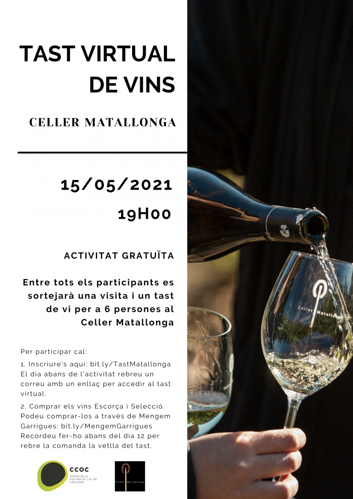 El Centre de la Cultura de l'Oli de Catalunya, conjuntament amb el Celler Matallonga, organitza pel dissabte 15 de maig a les 19h00 un tast de vins virtuals.