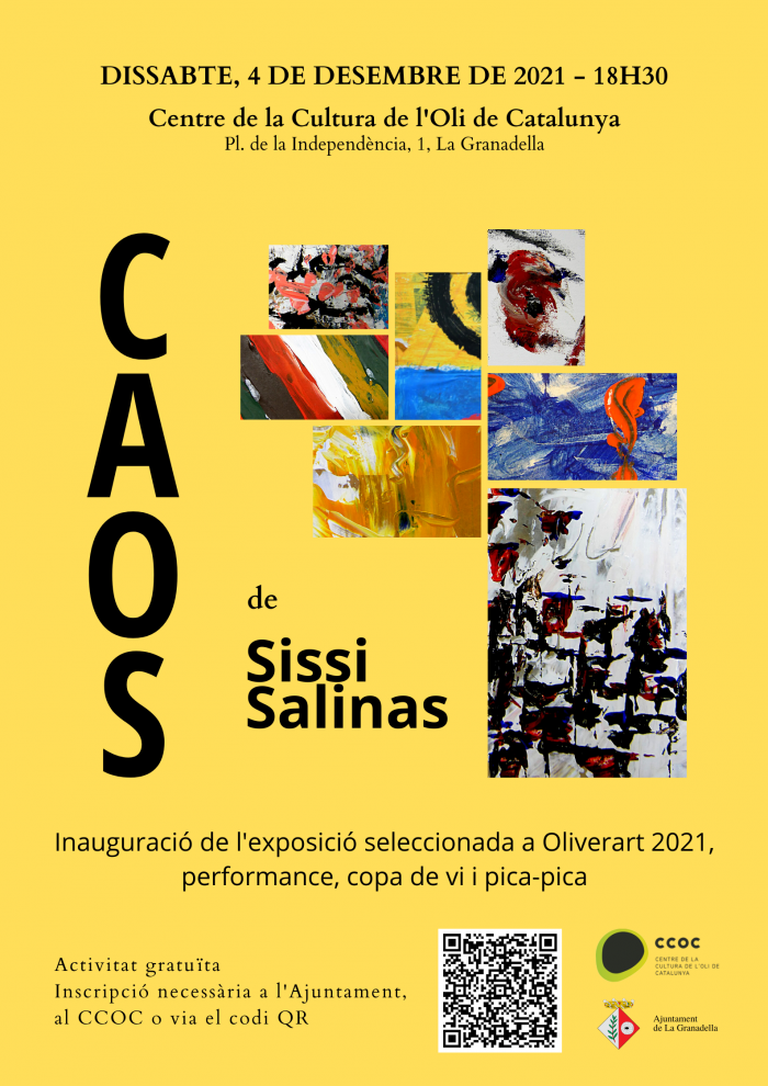 Dissabte, 4 de desembre, a les 18h30, tindrà lloc al Centre de la Cultura de l'Oli de Catalunya la inauguració de l'exposició "Caos", de l'artista Sissi Salinas, premiada al concurs Oliverart 2021. Serà una inauguració molt especial, amb performance, copa de vi i pica-pica. L'activitat és gratuïta. Cal inscripció prèvia via l'enllaç: https://bit.ly/sissisalinas