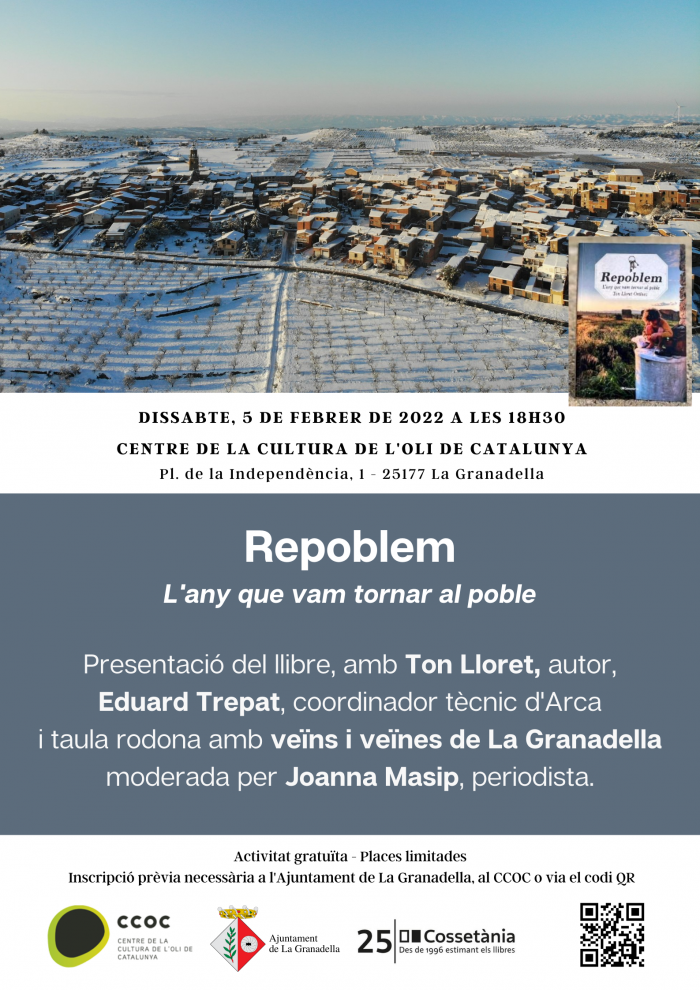 Dissabte 5 de febrer, a les 18h30, tindrà lloc al Centre de la Cultura de l'Oli de Catalunya la presentació del llibre "Repoblem. L'any que vam tornar al poble", amb Ton Lloret, l'autor, Eduard Trepat, coordinador tècnic d'Arca i taula rodona amb veïns i veïnes del nostre municipi.
