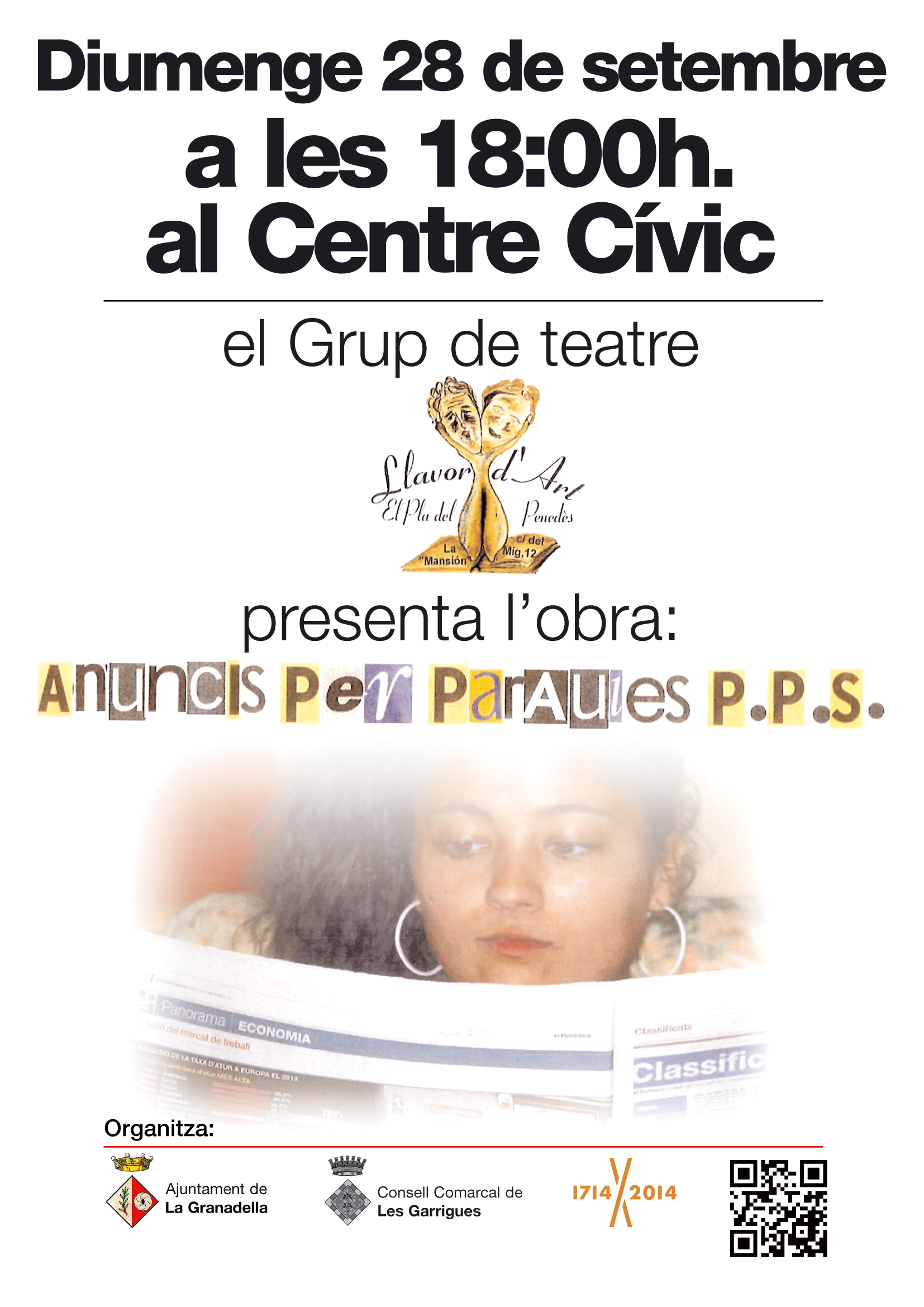 L'Ajuntament convida a tot el poble a l'obra de teatre "Anuncis per paraules" que tindrà lloc al Centre Cívic diumenge 28 de setembre a les 18:00h