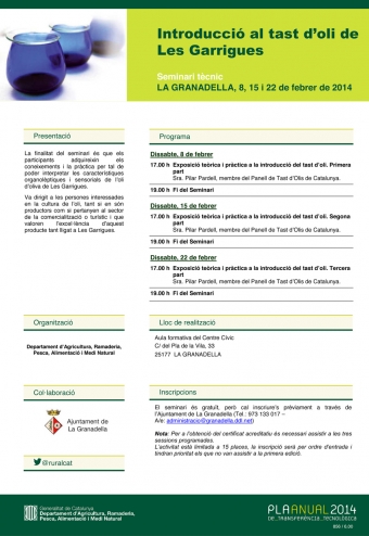 Informació sobre la realització d'un seminari de tast d'oli els dies 8, 15 i 22 de febrer de 2014 a l'aula formativa del Centre Cívic.