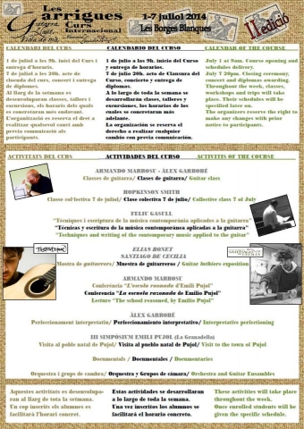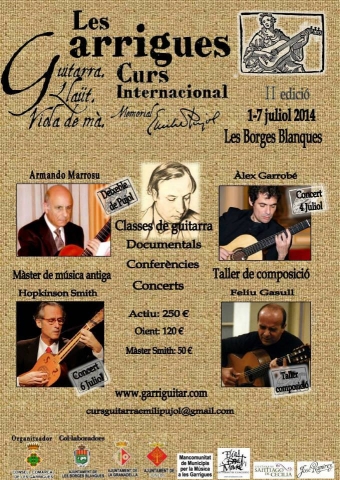 Segona edició del Curs Internacional de Guitarra, Llaüt i Viola de mà de les Garrigues Memorial Emili Pujol. Us volem convidar als cursos de guitarra i d'instruments de corda antics amb deixebles internacionals d'Emili Pujol, com en Hopkinson Smith i Armando Marrosu, que juntament amb el mestre guitarrista Àlex Garrobé impartiran classes individuals i col·lectives. També rebrem la visita d'altres convidats per impartir tallers i conferències.