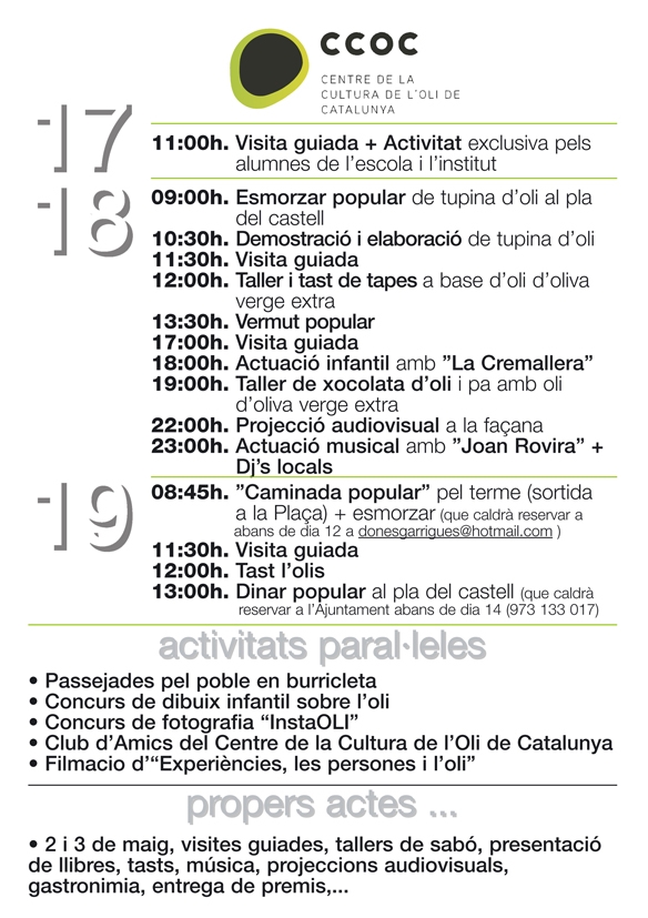Consulta totes les activitats que es faran en les jornades de portes obertes del Centre de la Cultura de l'Oli de Catalunya